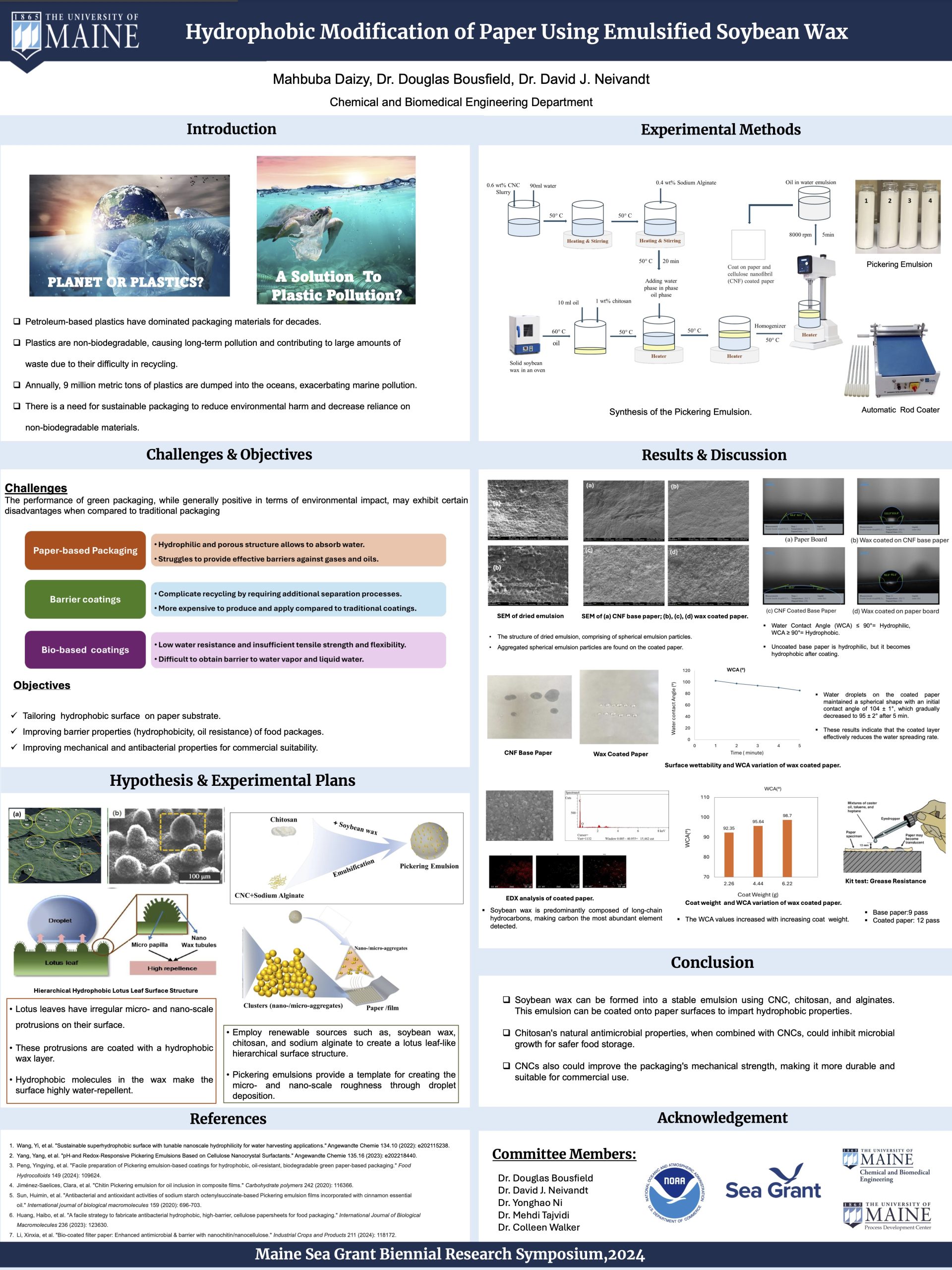 Daizy, M., Ni, Y., Bousfield, D. W., & Neivandt, D. J. (2025). Development of a soybean wax pickering emulsion for sustainable hydrophobic modification of paper. ACS Sustainable Chemistry & Engineering, 13(33), 13614–13627. https://doi.org/10.1021/acssuschemeng.5c06102